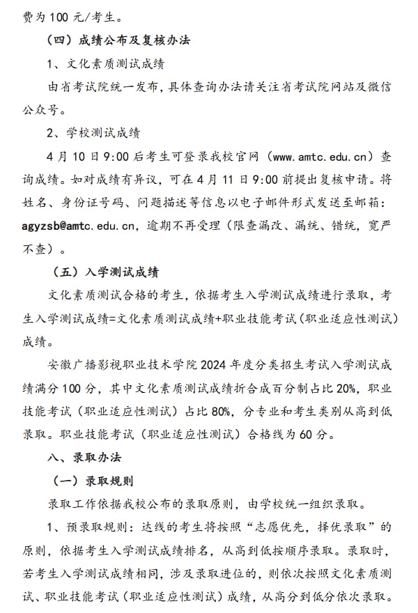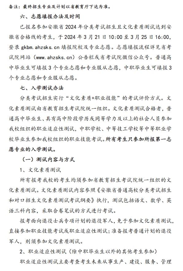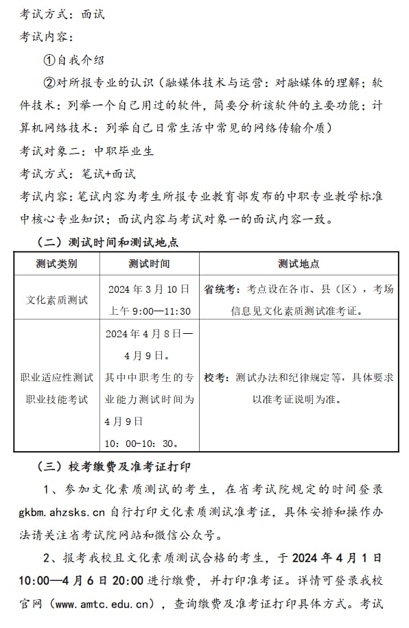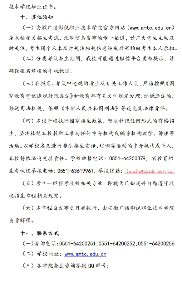 安徽广播影视职业技术学院2024年分类考试招生章程